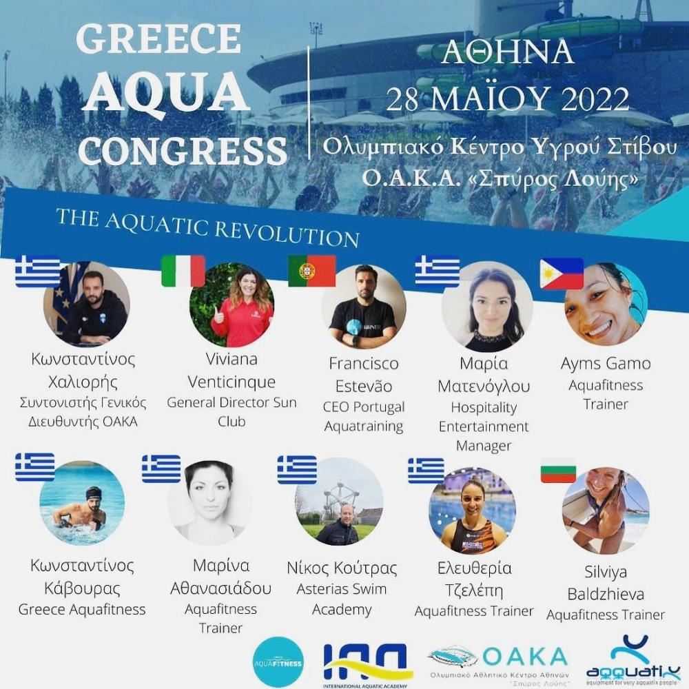Κατά τη διάρκεια του Greece Aqua Congress σημαντικοί ομιλητές από την Ελλάδα, την Κύπρο, την Ιταλία, την Ισπανία, και την Πορτογαλία αναφέρθηκαν στις νέες καινοτόμες υπηρεσίες υδρογυμναστικής, κολύμβησης και αποκατάστασης για όλες τις ηλικίες, ενώ οι συμμετέχοντες που επισκέφτηκαν την Ελλάδα αποκλειστικά για το συνέδριο ήρθαν από Αυστραλία, Ιταλία, Πορτογαλία, Κύπρο και Βαλκάνια.
